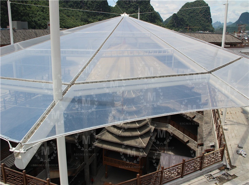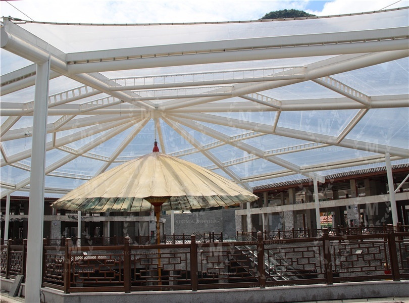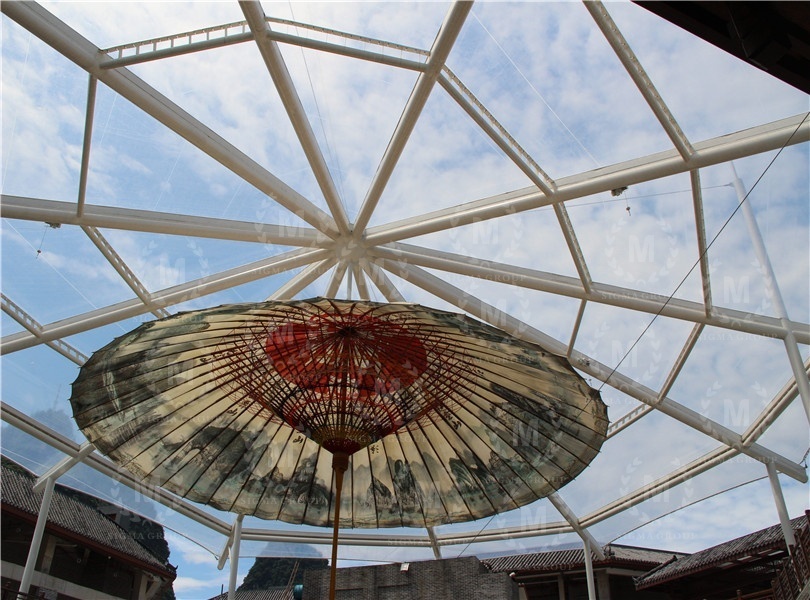 The design of dome is ETFE membrane structure , there hanging the world's largest oil paper umbrella under the dome,which shows an unprecedented visual shock. Seeing indoor from bottom to top as if a giant oil paper umbrella is floating in the air. In addition, ETFE membrane meets the daytime lighting and night lighting effects,meanwhile ,modeling and the overall building complex set off.