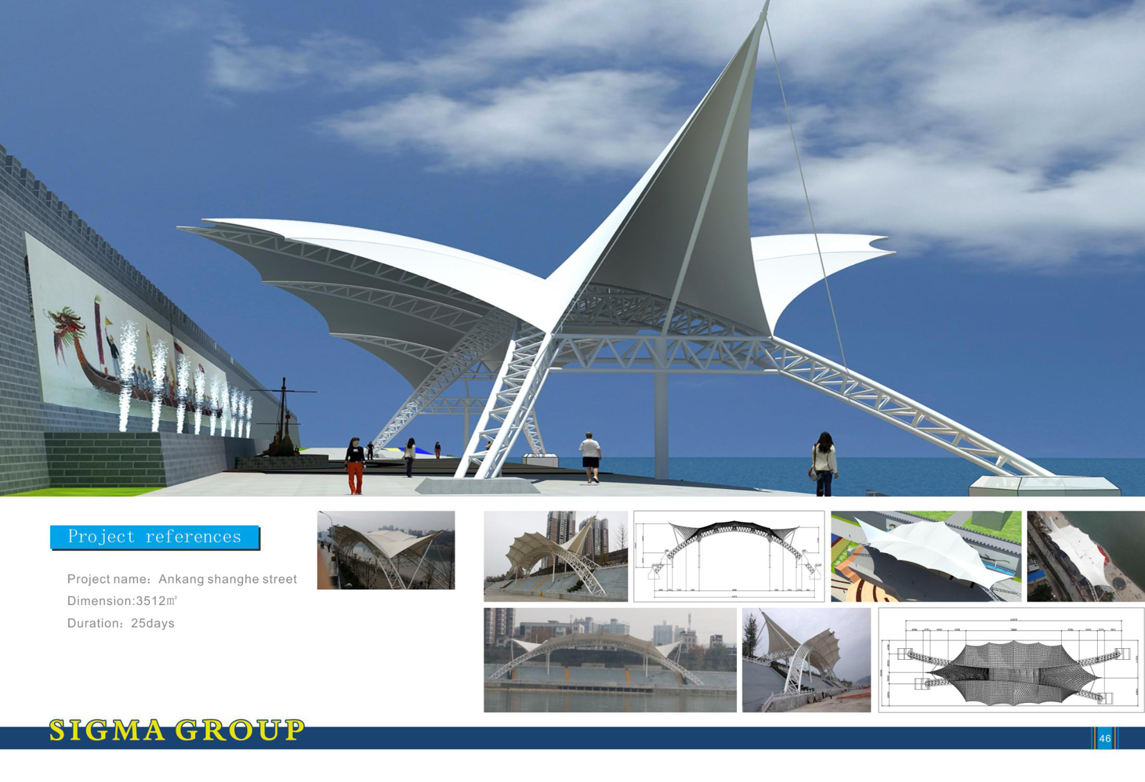 Tensioned membrane structures can be built in many different shapes and sizes. There are also many types including permanent, temporary, large, small, air-supported, or tensioned to name a few. Examples include open-air structures such as amphitheaters and entrance canopies or enclosed roofing systems, such as an airport facility (i.e. Denver International Airport), convention centers (i.e. the San Diego Convention Center), and even a domed stadium roof (i.e. the Georgia Dome).